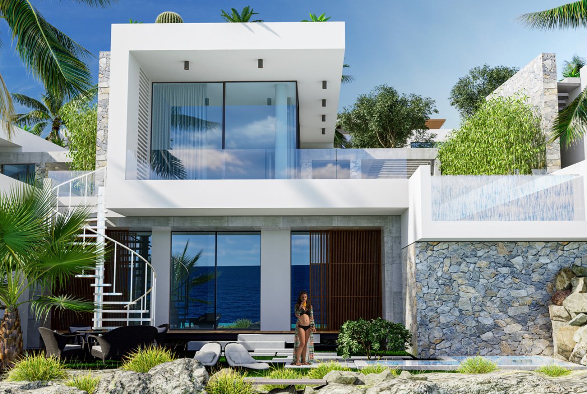 Ön cephedeki seçkin 8 villa, kayalık uçurumun kenarında yer almakta olup, uzaktan bakıldığında denizin üzerindeymiş hissi uyandırmaktadır. Villaların arka taraftaki özel yoldan görünümü tek katlı bir bungalov iken, aslında yatak odası katları yol kotunda yer alan yaşam alanlarının ve havuzun altında yer alıyor. Çatı terası, 360 derecelik deniz ve arkadaki dağ manzarası ile son dokunuşu yaparken, gömme dolaplı 3 en-suite yatak odası, denizin önünde, içten ve dıştan muhteşem deniz manzarasına sahip bir aşk bahçesine açılmaktadır.